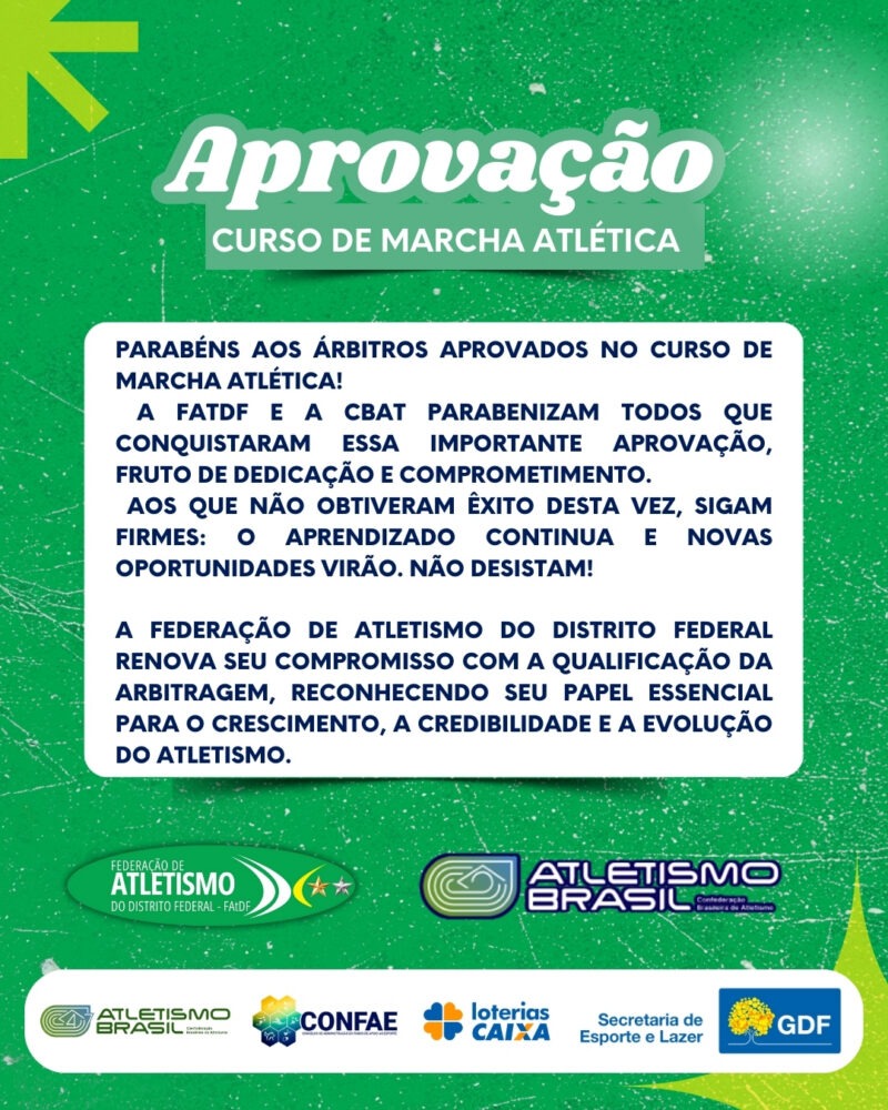 A Confederação Brasileira de Atletismo (CBAt) informou, por meio da Nota Oficial nº 002/2026, o resultado do curso de arbitragem em Marcha Atlética realizado pela Federação de Atletismo do Distrito Federal (FAtDF), nos dias 13 e 14 de dezembro de 2025. Disponível no link a seguir: Resultado Curso Marcha Atlética
