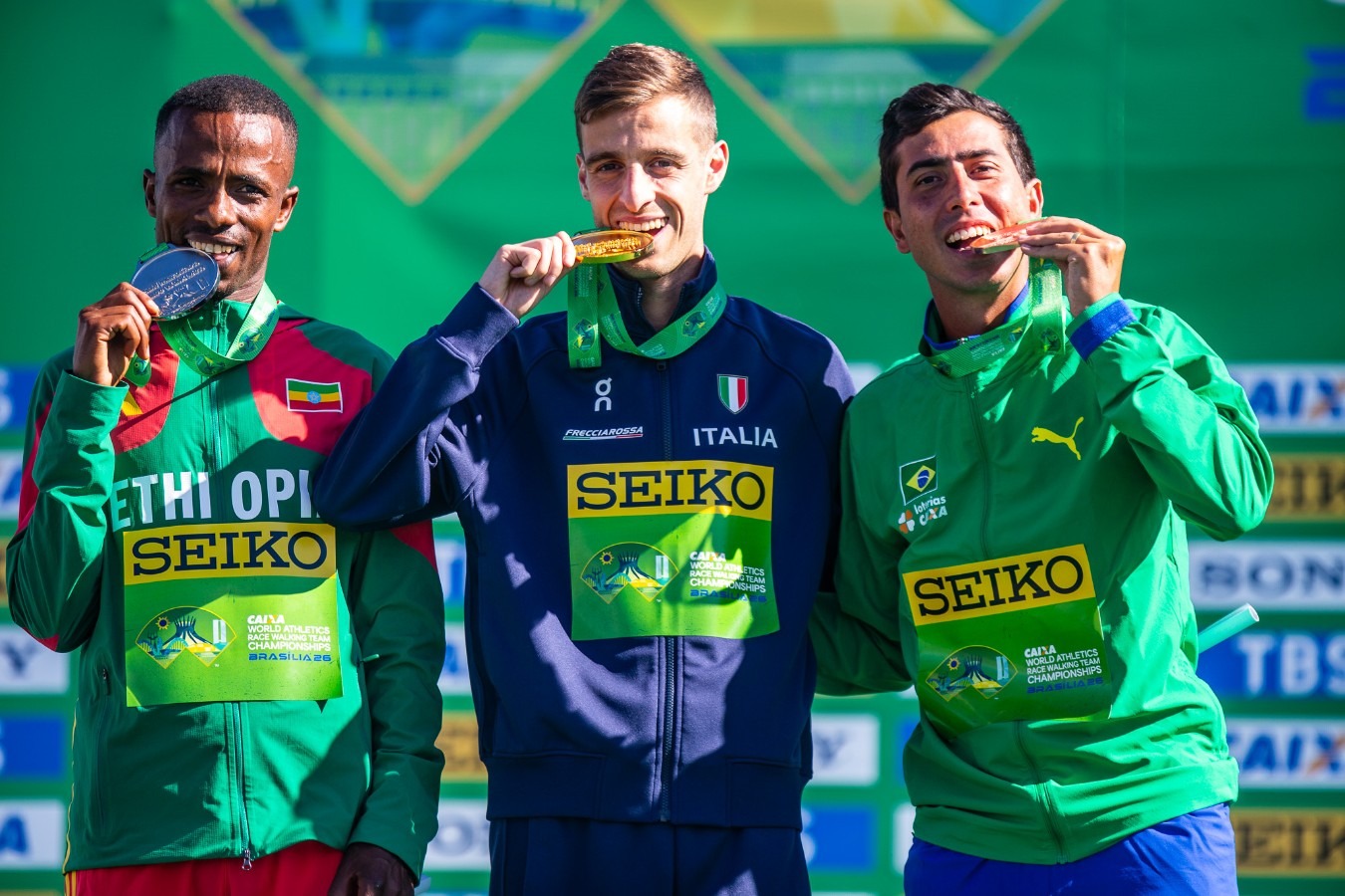 O brasiliense Caio Bonfim escreveu mais um capítulo histórico para a marcha atlética nacional ao conquistar, no último domingo (12/04), a medalha de bronze na meia maratona do Mundial de Marcha Atlética por equipes Brasília 2026. O resultado representa a primeira medalha masculina do Brasil na história da competição. Até então, apenas a pernambucana Érica Sena havia alcançado o pódio em etapas da Copa do Mundo.